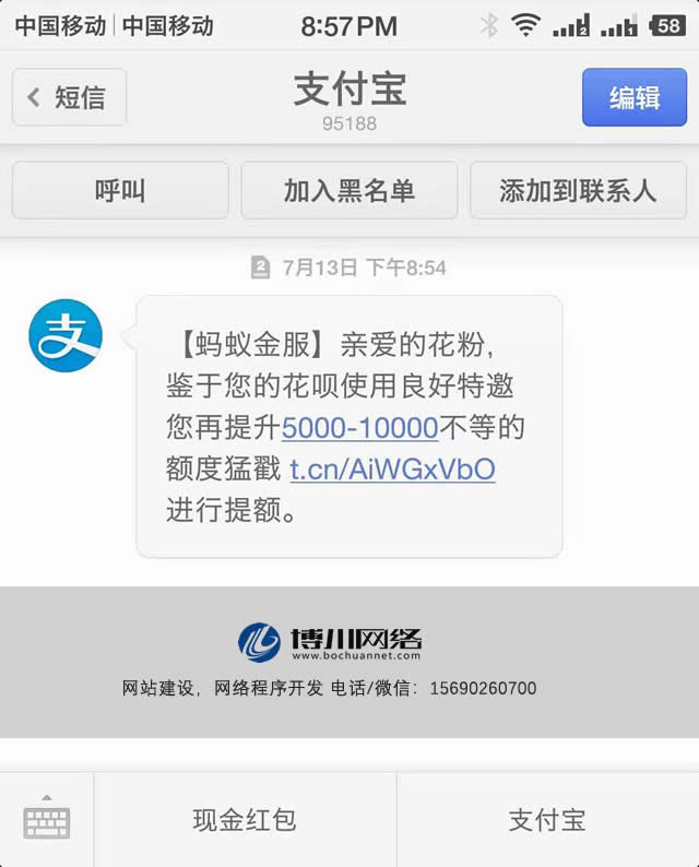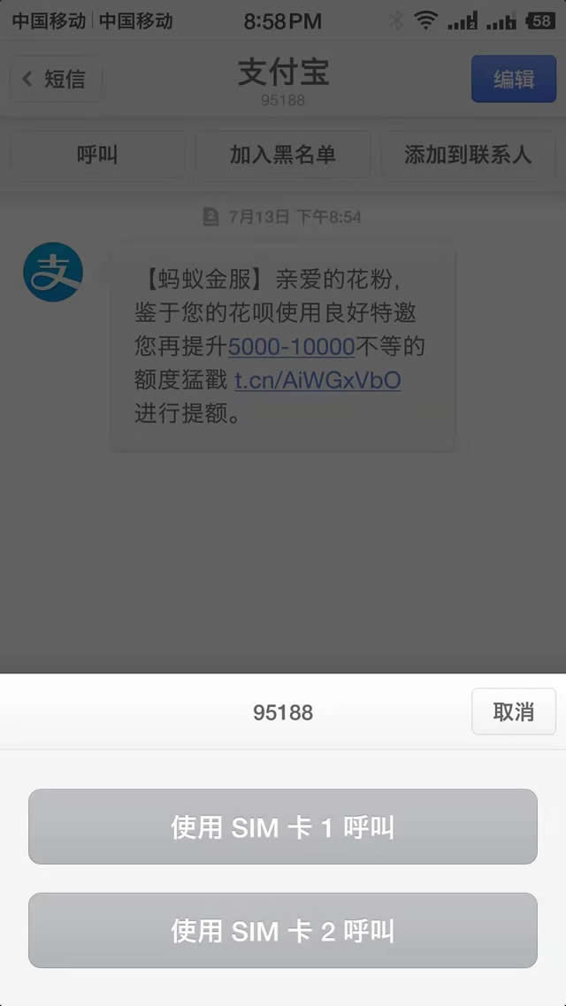 事件是這樣的:晚上8點54分的時候,忽然收到一條來自支付寶的短信,短信內(nèi)容為花唄的額度提額。