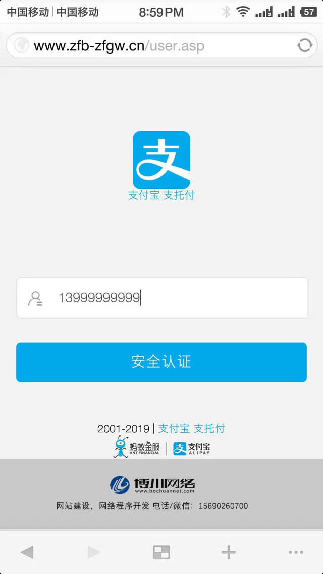 其實對于絕大多數(shù)的人來說,看到這里,也不會有任何的懷疑,因為打開的網(wǎng)頁的配色、括字體、圖片和各種細(xì)節(jié)基本上和支付寶官方網(wǎng)站一樣。 但是對于博川來說,點開網(wǎng)頁后的第一眼,就已經(jīng)判定這是一個釣魚網(wǎng)站了! 為了讓大家看的更加清楚,我們把下面的流程走完:上面的支付寶賬號那里,博川隨便輸入了一個假的手機號碼,直接進入下一個頁面。
