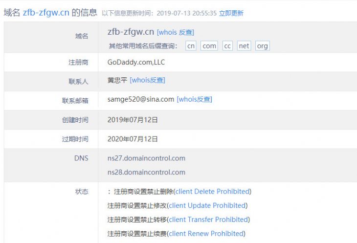 1、大多數(shù)人訪問網(wǎng)站沒有注意網(wǎng)址的習(xí)慣,這個網(wǎng)站的域名(www.zfb-zfgw.cn)并不是支付寶或者的官方(alipay.com)域名,這也是博川一眼就認(rèn)定這是虛假網(wǎng)站的原因。查詢域名注冊信息之后發(fā)現(xiàn),果然,這是一個昨天(7月12日)才剛剛注冊的新域名,正常來說一個正規(guī)網(wǎng)站涉及到開發(fā)、備案、上線測試等多個流程,是不可能注冊后就立即使用的。而且,域名的注冊人為個人,所使用的注冊郵箱也是一個個人新浪郵箱號。像支付寶這樣的公司,是不可能采用這樣不正式的注冊形式的。